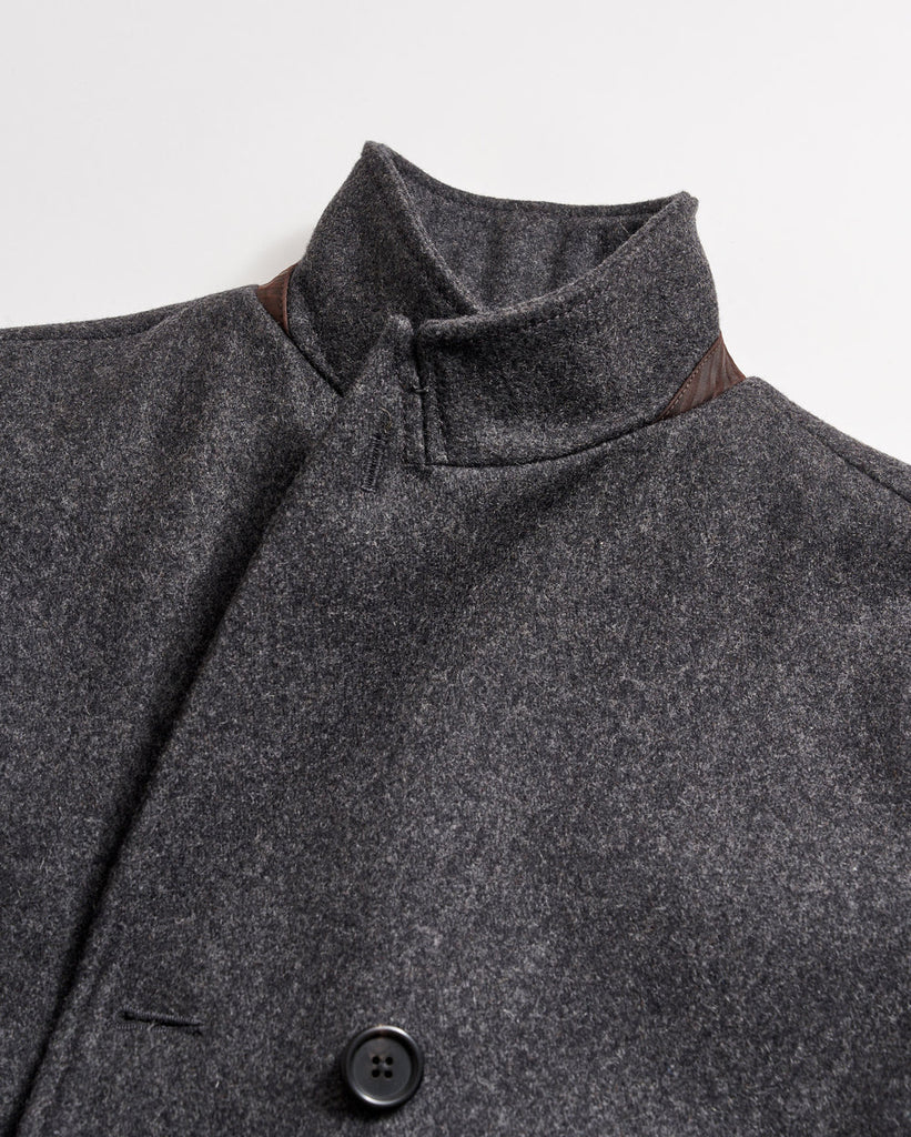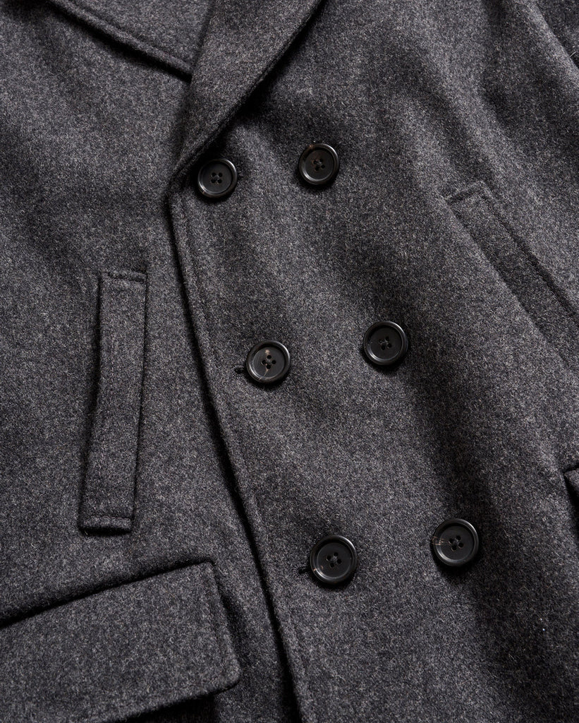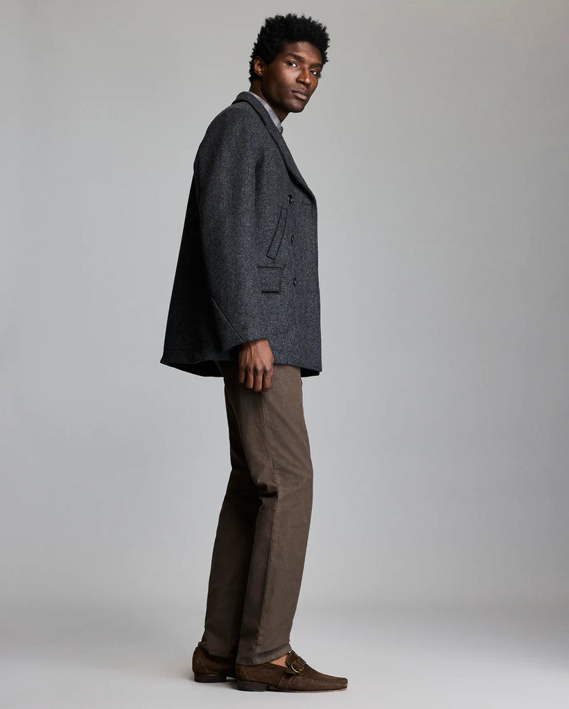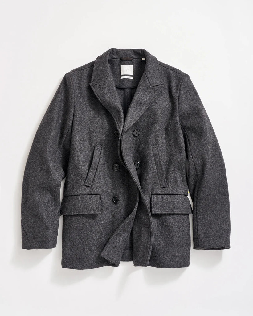 Billy Reid's first version of the Bond Peacoat dates back two decades. Originally named after their Bond Street store in New York, Daniel Craig famously wore it in the James Bond movie Skyfall. The response to that moment made the peacoat one of Billy Reid's most beloved pieces. The iconic Bond is made in Italy from warm, sturdy Melton wool and thoughtfully finished with bound seams. This mark of craftsmanship eliminates the need for a liner, reducing bulk and ensuring comfort. The piece is finished with our signature heirloom ribbon stripe embossed on luxe calfskin leather under the collar, handwarmer chest pockets, and genuine horn buttons. It remains an enduring take on a menswear classic.