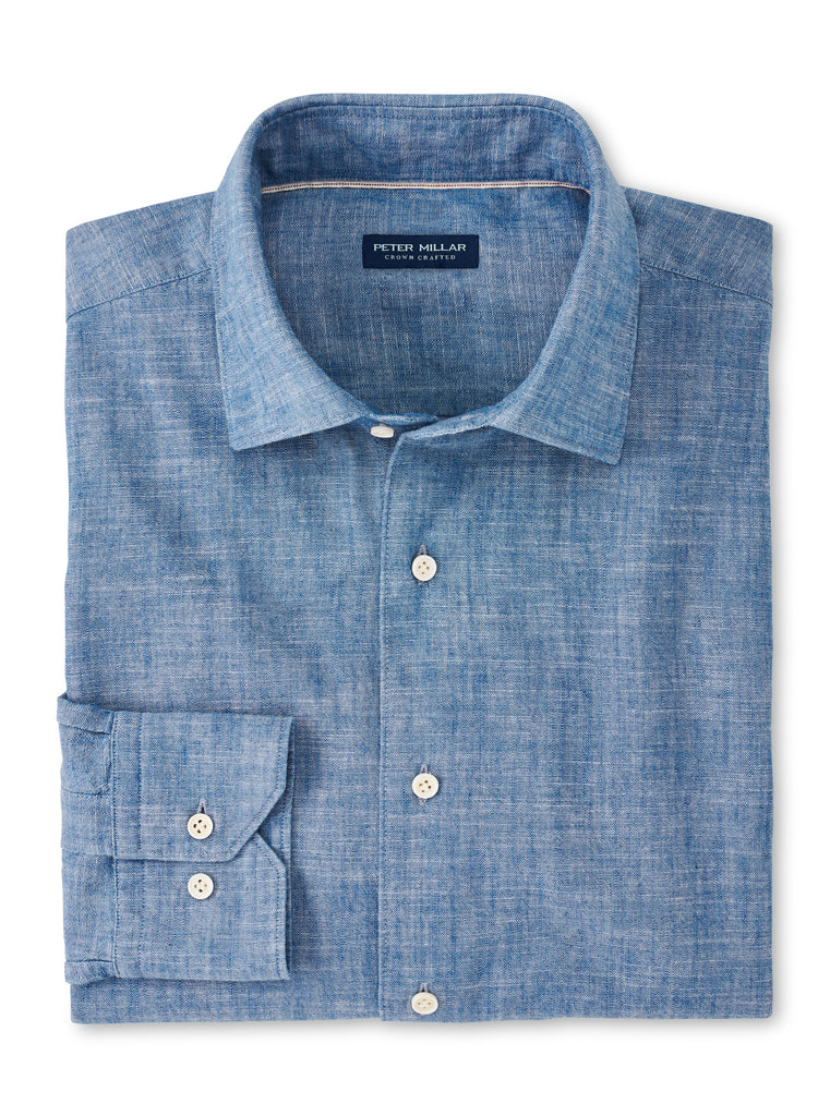 This refined casual sport shirt is fashioned from an exceptional Japanese selvedge chambray for iconic everyday style. It’s finished with a spread collar, French placket, matte bone buttons and mitered cuffs.