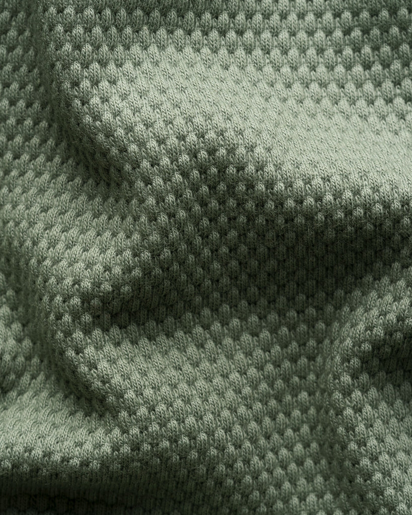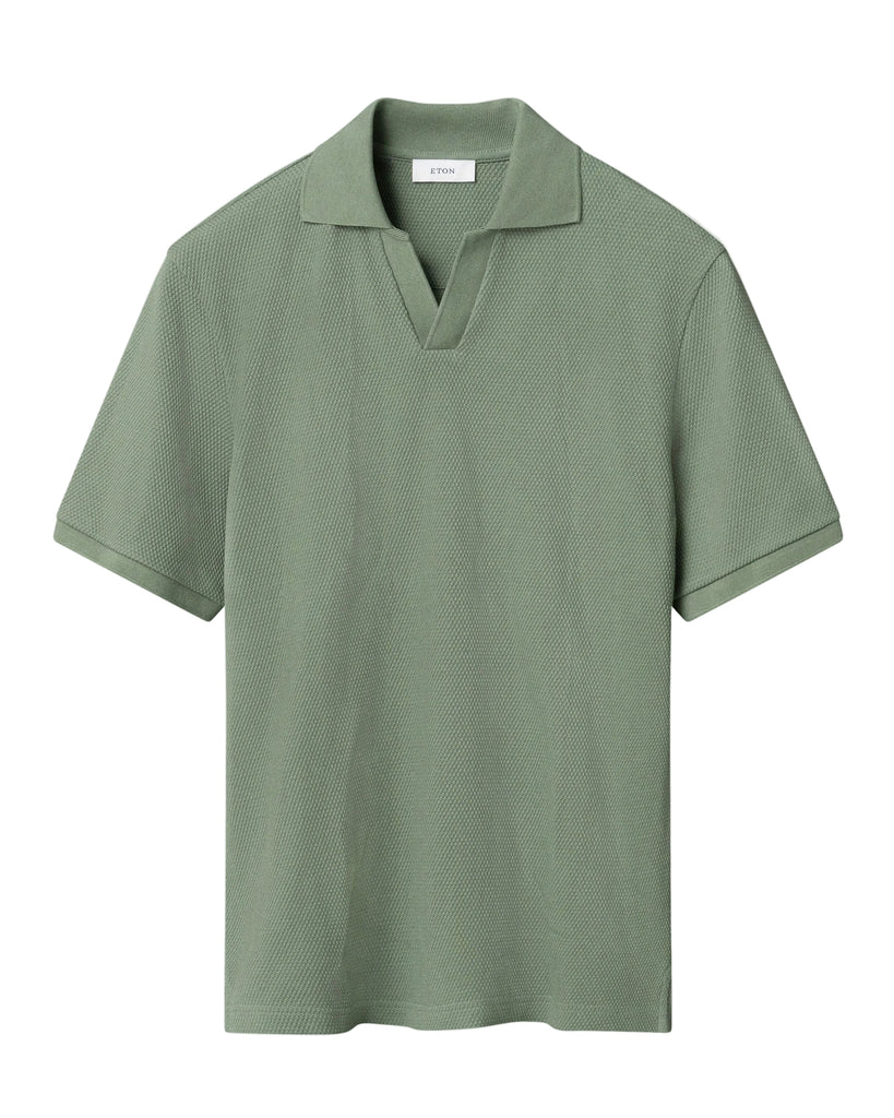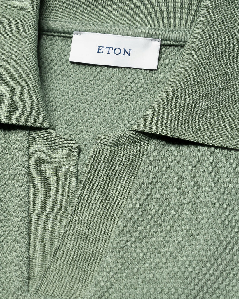 A short-sleeve polo shirt crafted from an interlock cotton jersey jacquard fabric with a touch of elastane for extra flexibility and made in a waffle knit for a rich look and feel. Designed for a regular fit, it features an open collar for a relaxed yet refined appearance.
