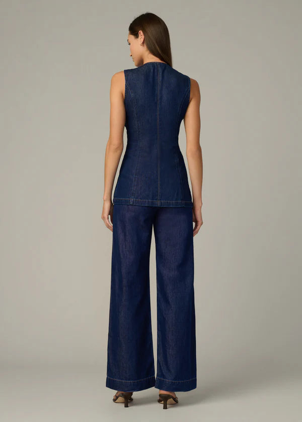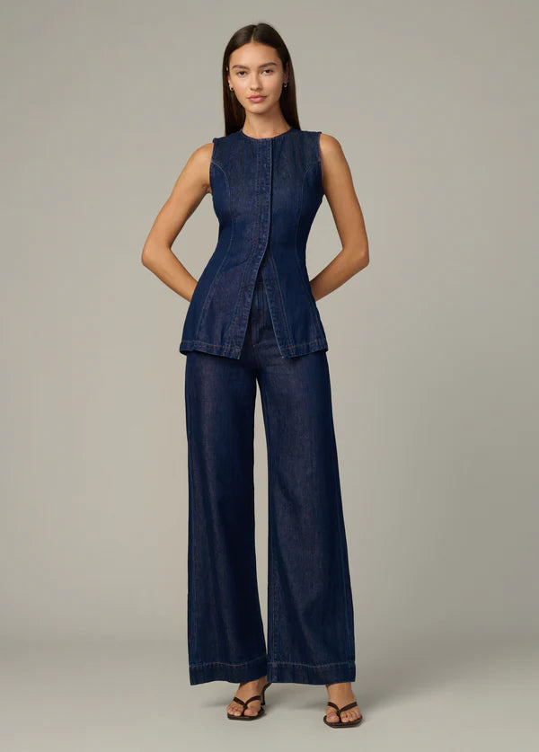 A high-rise, weightless denim trouser that is fitted at the waist and hip with a full-length wide leg.