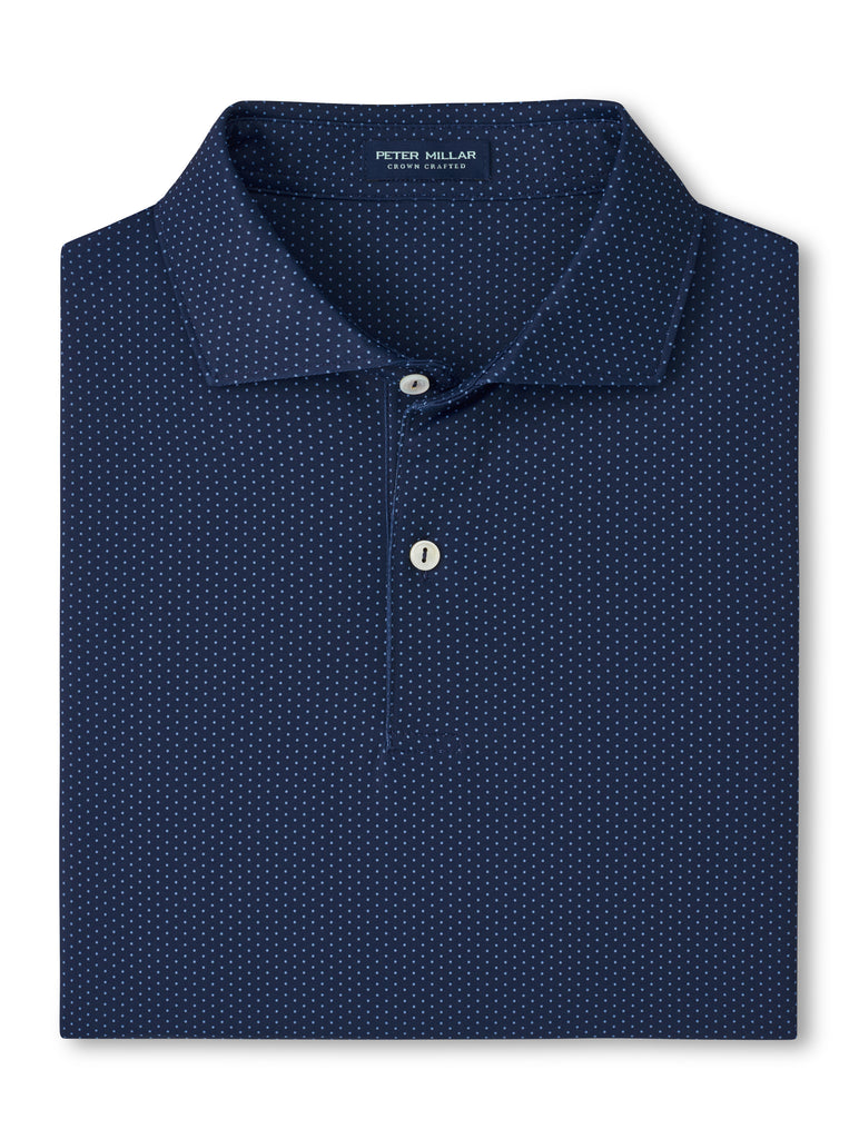 With clean style and exceptional comfort, Peter Millar's Crown Crafted jersey polos bring a soft, plush feel with wicking, four-way stretch, easy-care and UPF 50+ sun protection. This shirt features a custom-designed geometric dot print for added style. Finished with a spread collar and detailed with mother-of-pearl buttons.