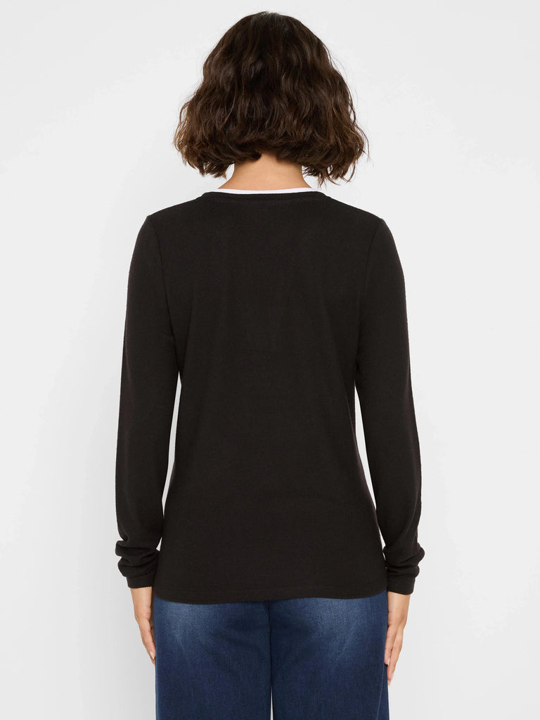 A layered look with less effort. This two-fer top features placed interior jersey to create the illusion of an underlayer while also creating chic color contrast: an easy way to mix up your everyday top. We love the dramatic split neck with the slight overlap at the base of the V. Wear it with denim or a clean trouser.