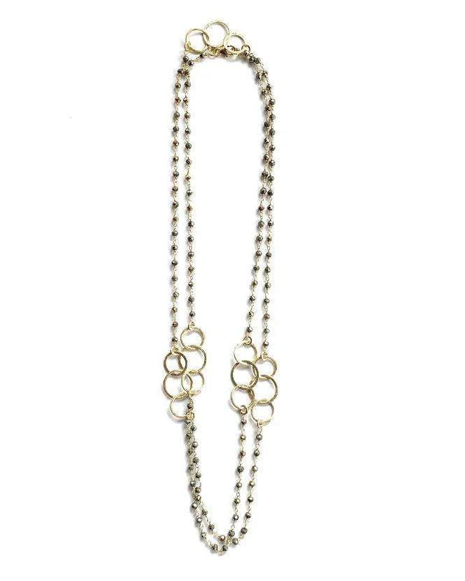 Get ready to look chic and flawless with this gold and matte gray necklace. Perfect for layering with any outfit, this 36 to 40-inch necklace features small, wire wrapped gray stones and brushed gold hoops throughout. Wear it long or wrap it for a versatile look.