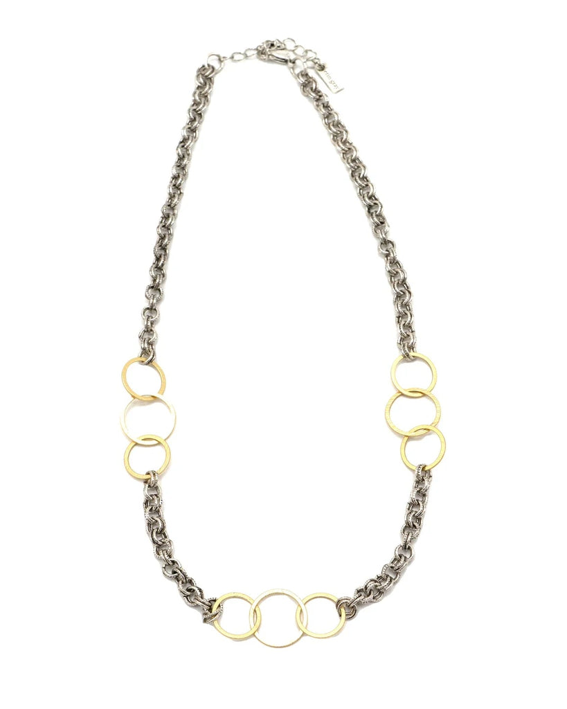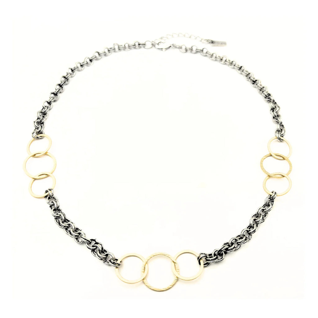 Part of the erin gray mixed metal allure collection, this refined and versatile necklace is a stunner for any event. It showcases three brushed gold hoops linked by a striking silver chain, offering an elegant and adaptable style. The chain adjusts from 16 to 18 inches for a customized fit.