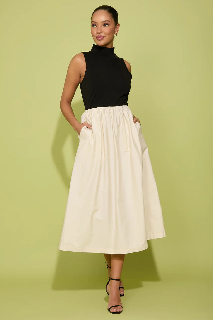 The Nicola is a two-fabric dress that makes a statement through contrast. A fitted sleeveless knit bodice with a mock neckline sits close to the body, then transitions into a full, voluminous woven skirt at the waist. The skirt is generously gathered and structured, creating a wide, rounded shape that falls cleanly to midi length. Side pockets are tucked into the skirt, adding everyday practicality to a dress that already has a lot going for it.