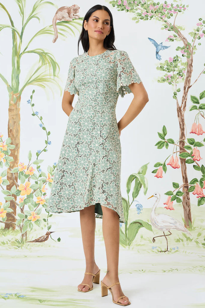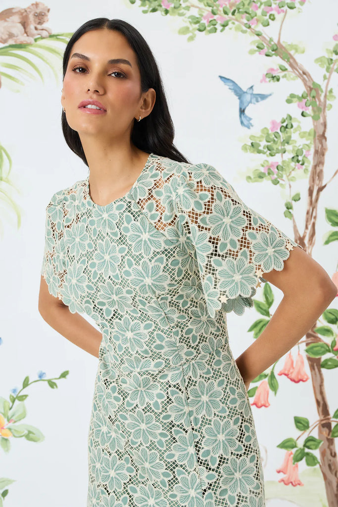 Artisanal lace takes center stage, where intricate floral patterns create a modern heirloom effect. The flutter sleeves and asymmetric hem merge vintage inspiration with contemporary design. Perfect for garden weddings, afternoon teas, or sophisticated brunches. When romantic refinement matters.