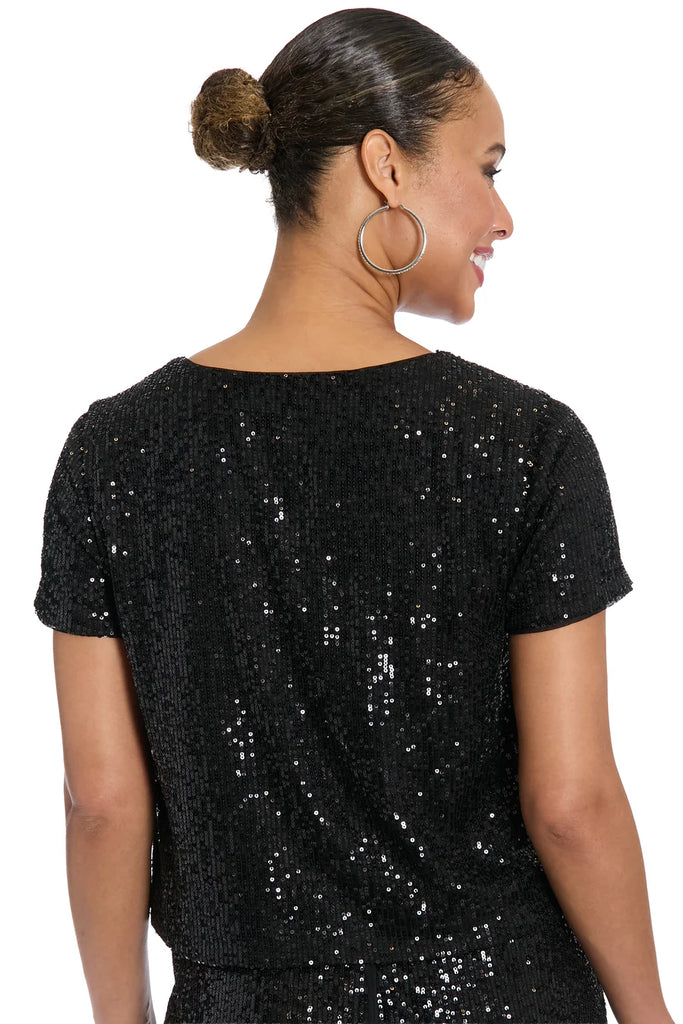 This top dazzles with its all-over sequined embellishment and flattering V-neckline that creates a stunning focal point for any celebration. The relaxed blouson silhouette and short sleeves offer comfortable elegance, while the waist-length cut provides perfect proportions for high-waisted styling. Ideal for New Year's parties, cocktail receptions, or night-out adventures, this show-stopping top pairs beautifully with sleek trousers or mini skirts for a look that guarantees you'll sparkle under any spotlight.