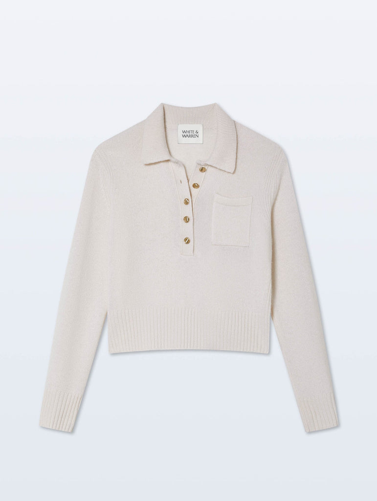 A polished classic, elevated for the season. Knit in 100% cashmere with a soft drape and straight fit, this long-sleeved polo is embellished with gold buttons and a clean pocket detail.